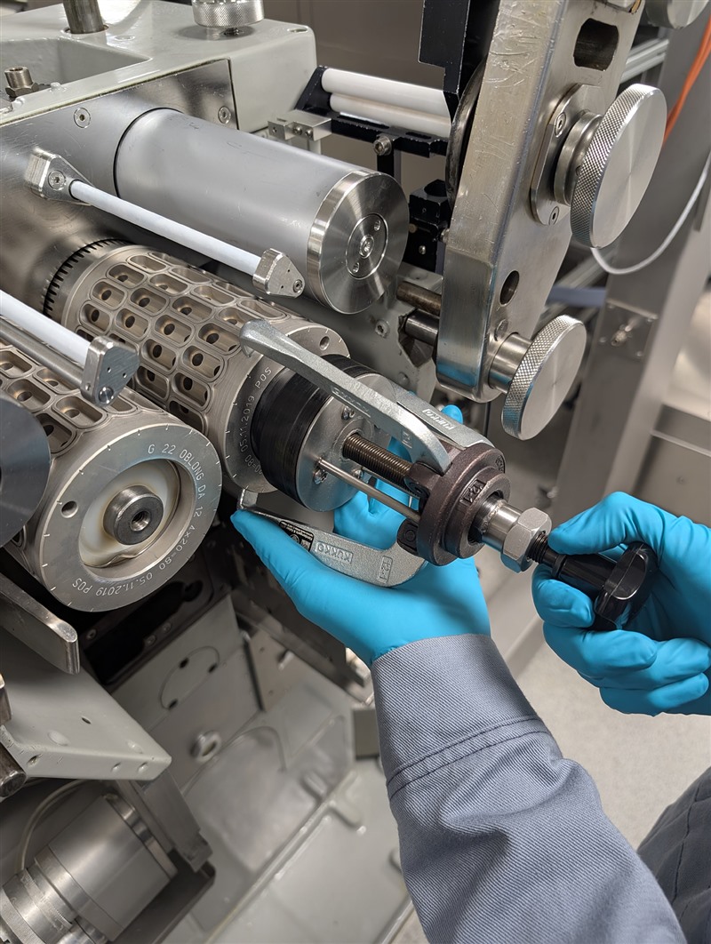 Die Formatteile müssen bei jedem Chargenwechsel ausgebaut werden. Diese Arbeit erfolgt händisch und wird täglich vielfach durchgeführt. Da die Formatteile präzisionsbedingt einen sehr festen Sitz auf der Aufnahme benötigen, müssen diese durch ein „Ruckeln“ abgezogen werden. Hierbei entsteht die Gefahr von Prellungen und Quetschungen zwischen den Formatteilen und anderen Maschinenkomponenten.