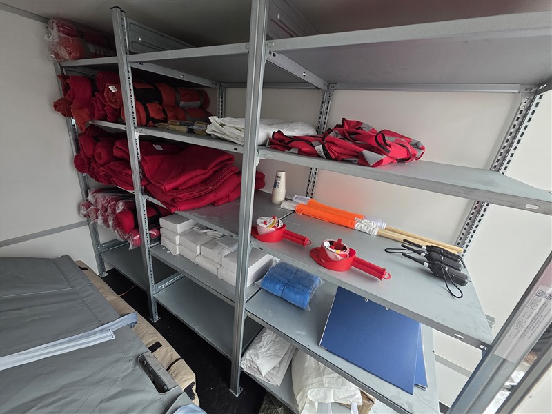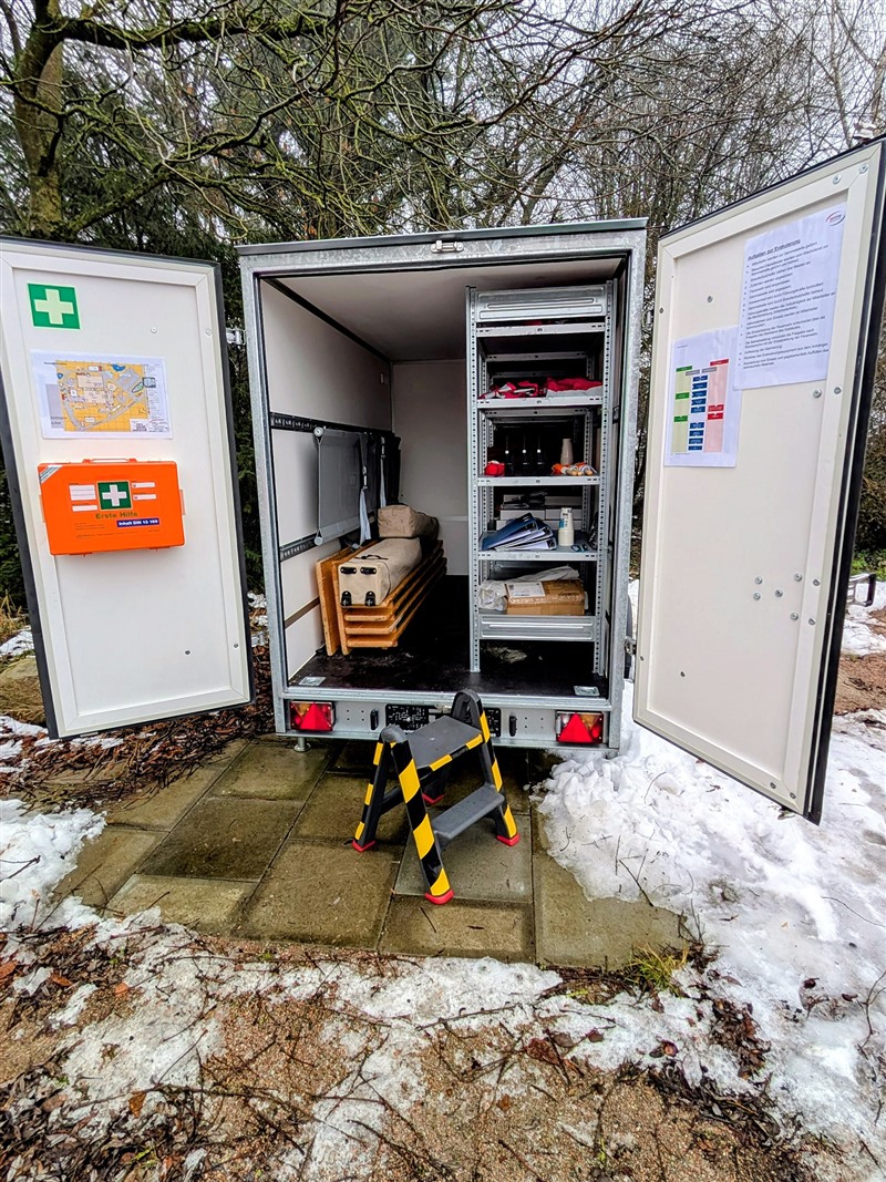 Der SOS-Anhänger hält alles Wichtige für Notsituationen bereit. Die Beschaffung ist einfach und günstig. Mit kleinen Umbauten ist das System rasch einsatzbereit. An den Flügeltüren befinden sich die wichtigsten Informationen. In eingebauten Regalen lagern die Hilfsmittel.
