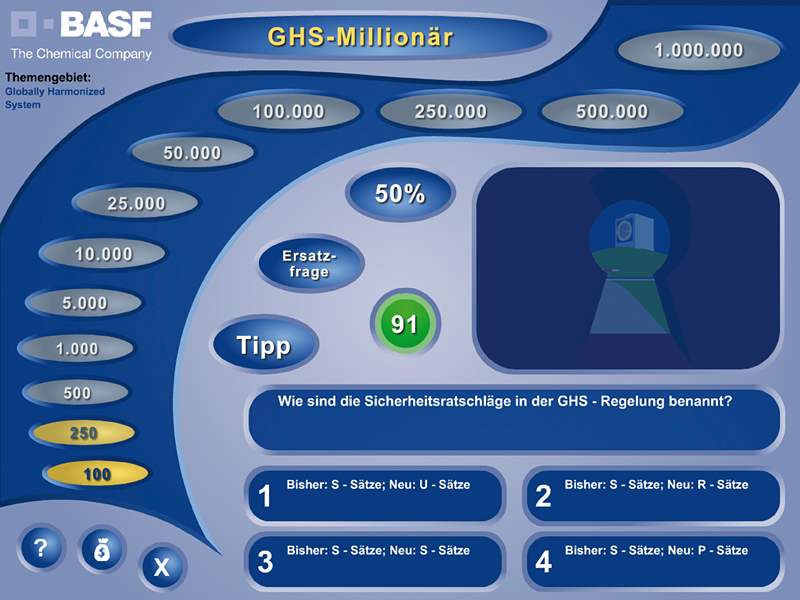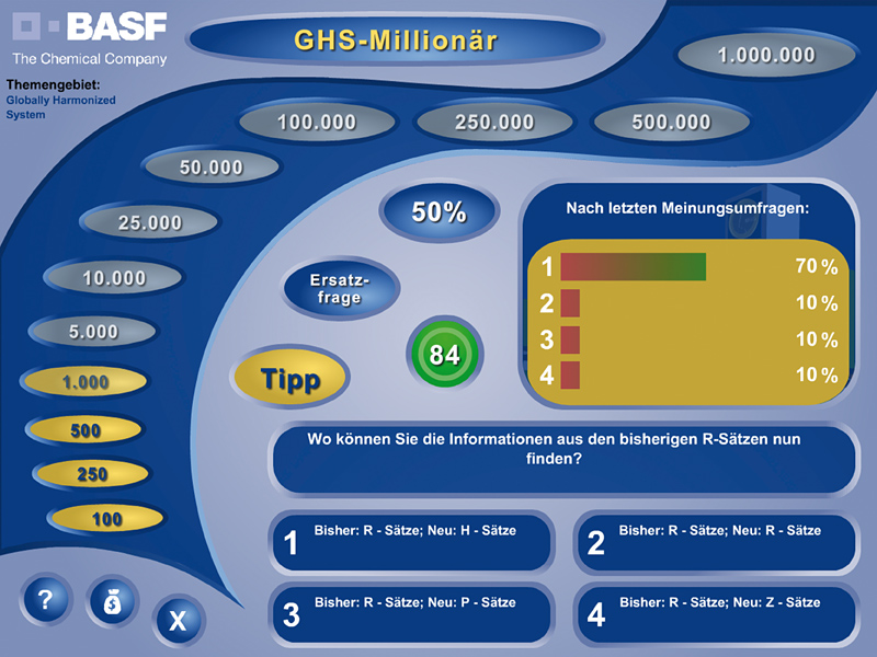 Gegenstand des Förderpreisbeitrags ist die Weiterbildung der Mitarbeiter zum Thema GHS. Über ein PC-Programm, das in spielerischer Form an eine bekannte Fernseh-Quizshow anknüpft, können die Nutzer ihr Wissen zum neuen Thema GHS spielerisch vertiefen, Erlerntes üben und sich selbst testen.