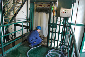 Nach der Bremsenprüfung werden die Behälter in einen Sammelbehälter entleert und wieder entfernt. Der Vorschlag wurde erfolgreich umgesetzt und eröffnet an einer Vielzahl von mittleren und kleineren Schächten, insbesondere solchen mit schlechter Zugänglichkeit des Korbes, eine rückenschonende Vor- und Nachbereitung von Bremsenprüfungen.