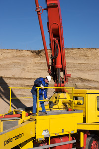 Im Unternehmen peterbeton Rudolf Peter GmbH & Co. KG hat man sich intensiv mit der Frage beschäftigt, wie Arbeiten im Drehkranzbereich einer Autobetonpumpe sicherer ausgeführt werden können. Bei der Entwicklung einer Lösung waren die Vorgaben der Straßenverkehrsordnung und die Beibehaltung der vollen Funktionsfähigkeit der Autobetonpumpe sowie eine einfache und schnelle Montage durch den Pumpenmaschinisten zu beachten. Im Ergebnis wurde ein ausklappbares Geländer entwickelt, das die beschriebenen Anforderungen in vollem Umfang erfüllt und damit ein sicheres Arbeiten im Drehkranz einer Autobetonpumpe ermöglicht.