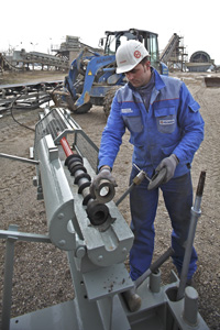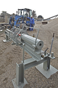 Im Unternehmen Hülskens GmbH & Co. KG suchte Henning Krebber-Hortmann nach einer Lösung, wie diese Arbeiten sicherer, mit weniger körperlicher Anstrengung und schneller ausgeführt werden können. Er entwickelte eine Vorrichtung, bei der die Tragrolle in einem Arbeitsgang hydraulisch auf die in einer Betonform eingesetzten Stützringe geschoben wird. Die Demontage erfolgt dann in umgekehrter Reihenfolge. Die verschlissene Tragrolle wird in die Form eingelegt und die Welle hydraulisch herausgepresst. Die für den Betrieb der Hydraulikanlage notwendige Energie wird von einem Radlader mit herstellerseits angebrachten Hydraulikanschlüssen geliefert. Während des Betriebes der Vorrichtung ist die Schalung sicher verschlossen und der Vorgang kann ohne Probleme von einem Mitarbeiter ausgeführt werden.