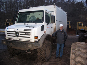 Zunächst wurde von einer Fahrzeugspezialfirma ein einklappbarer dreiteiliger Seitenschutz auf dem Dach des Fahrzeugs angebracht. Bereits durch das Herunterklappen der Steigleiter wird auf dem Dach ein einseitiges Geländer automatisch aufgerichtet. Damit ist schon beim Aufstieg die Absturzgefahr minimiert. Von dem so gesicherten Stand aus werden dann auf dem Fahrzeugdach weitere dort befindliche Geländeteile für die übrigen Seiten hochgeklappt und arretiert. So entsteht eine sichere Arbeitsbühne, von der aus Reparaturen, beispielsweise am Ausleger eines Hydraulikbaggers, durchgeführt werden können.