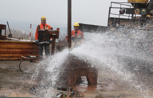 Wird die Rohrverbindung getrennt, ergießt sich das Wasser aus der Steigleitung über den Brunnenplatz. Dies erhöht die Gefahr, auszurutschen. Im Winter besteht zusätzlich die Gefahr der Bodenvereisung. Beim Lösen und Ablegen der Rohre befinden sich die Mitarbeiter zudem im Bereich schwebender Lasten. Und der Untergrund, auf dem sie sich bewegen, ist extrem uneben.