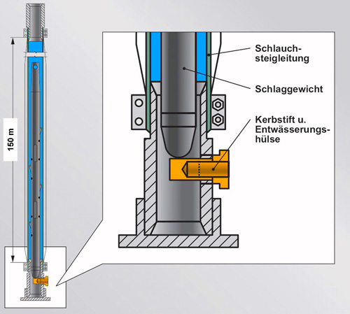 Bei dem neu entwickelten Verfahren tritt an die Stelle der Stahlrohre eine Schlauchsteigleitung aus einem flexiblen, hochbelastbaren, korrosionsfreien und wasserundurchlässigen Druckschlauch. Er wird auf die Schlauchwinde eines geländegängigen LKW aufgewickelt. Vor dem Aufwickeln muss auch der Schlauch entleert werden. Das erfolgt mittels eines Schlaggewichtes, das am Ende der Schlauchleitung eine Entwässerungshülse öffnet. Das Wasser bleibt somit im Brunnen.