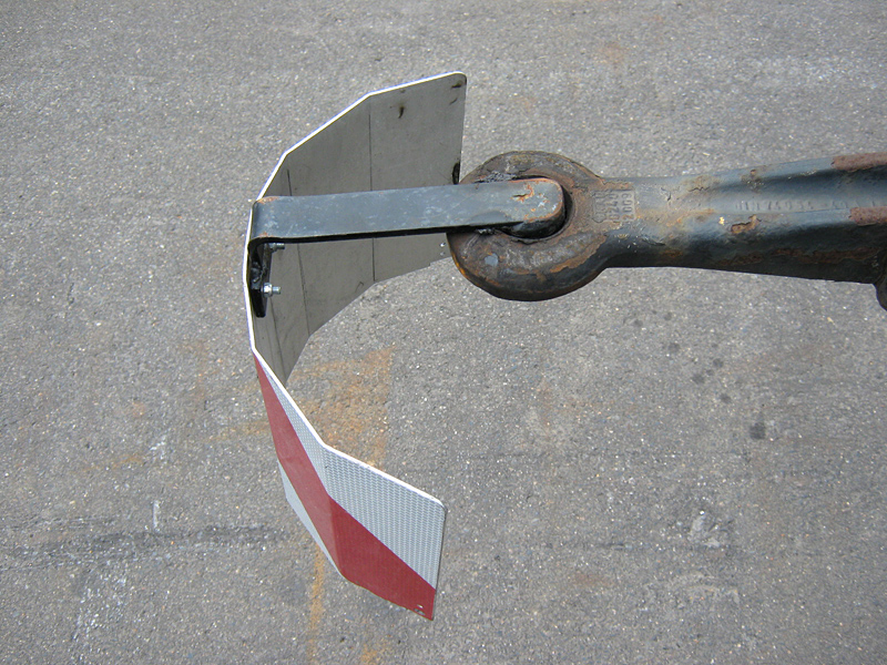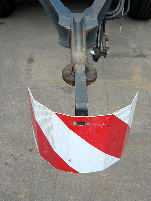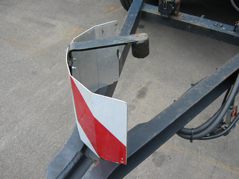 Damit Kollisionen vermieden werden, muss die Deichsel deutlich sichtbar sein. Zur Umsetzung des Vorhabens dient ein herkömmliches, schräg weiß-rot gestreiftes, reflektierendes Warnschild. Durch mehrfaches Kanten wird dieses Schild zu einem 180 Grad-Halbbogen geformt. Ein Flacheisen wird an einem Ende um 90 Grad gebogen. An den nun senkrechten Teil des Flacheisens wird das gebogene Warnschild geschraubt. Am anderen Ende des Flacheisens wird an der Unterseite ein Rundbolzen angeschweißt.