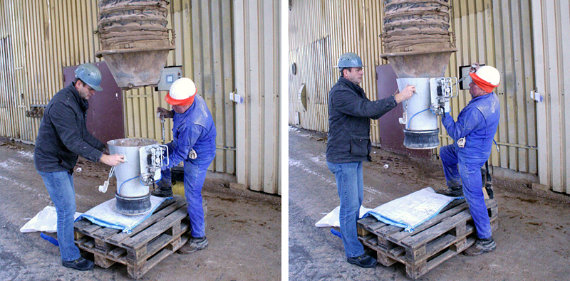 Die Befestigung von Big Bags an den konisch zulaufenden Verladerüsseln geschieht im Normalfall über selbstgebaute Adaptereinrichtungen, die jedoch die Staubentwicklung nicht vollständig verhindern. Darüber hinaus besteht immer die Gefahr, dass Finger oder Hände zwischen Eigenbau-Adapter und Verladerüssel eingequetscht werden.