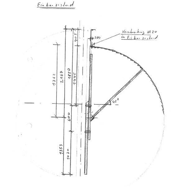 Die Stützbügel für die Leiter sind am unteren Ende der Leiterholme angeschlagen. Nach dem Einhängen der Leiter in die Kugelmühle werden die Stützbügel seitlich um bis zu 45 Grad ausgeklappt. Leiterholme und Stützbügel bilden dann ein nach oben offenes V. Die Leiter wird nun nicht mehr nach unten hin abgestützt, sondern nach schräg oben am Mühlenmantel.