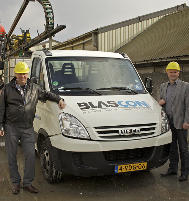 Ausgehärtete Betonreste in Fahrmischertrommeln werden durch einen Mitarbeiter mit Hilfe eines Stemmhammers entfernt. Gefährdungen entstehen durch Lärm, Staub, Betonsplitter und scharfe Kanten. Zusätzlich bedeutet die Tätigkeit eine Zwangshaltung. Die Blascon Industrielle Reinigungen GmbH, Nordhorn, führt die Reinigungsarbeiten mittels Hochdruckwasserstrahl durch.