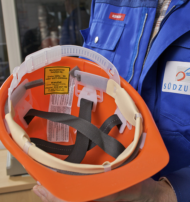 Bei einem Arbeitsunfall müssen die werksinternen Telefon-Notrufnummern schnell zur Hand sein. Eine werksinterne Umfrage der Südzucker AG, Obrigheim, zeigte, dass viele Mitarbeiter keine Kenntnis von diesen wichtigen Rufnummern hatten. Um eine schnelle Verfügbarkeit zu garantieren, sind die Notrufnummern deshalb direkt im Schutzhelm hinterlegt.