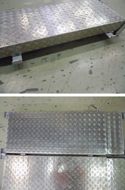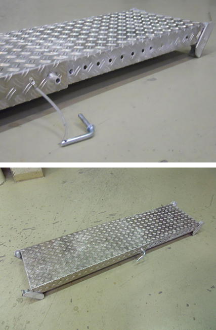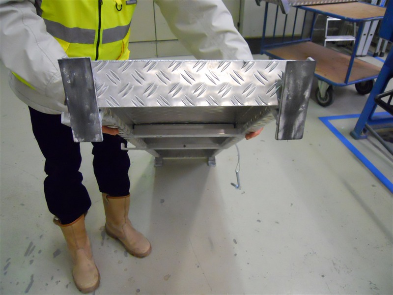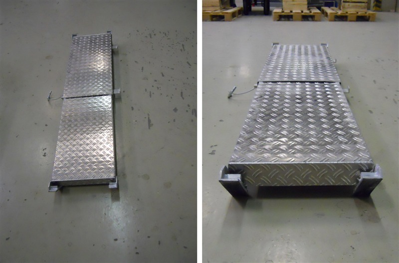 Zur Schaffung eines sicheren Standplatzes für Wartungsmitarbeiter im Filtergehäuse stehen nun zwei Aluminium-Plattformen bereit, die jeweils 400 Millimeter Breite aufweisen und in der Länge zwischen 1.000 und 1.600 Millimetern variabel sind. An den Stirnseiten befinden sich Schwenkwinkel, die in einem Winkelbereich zwischen 100 und 130 Grad verstellbar sind und sich dem Konuswinkel des Filtergehäuses anpassen. Die beiden Plattformen lasen sich miteinander verbinden, so dass die Standfläche je nach Bedarf verdoppelt werden kann.