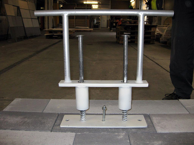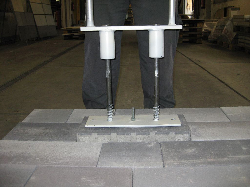 Das neue Pflastersteinziehgerät wiegt nur 14 Kilogramm und ermöglicht einfacheres Arbeiten. Zunächst wird der defekte Pflasterstein mit Dübel und Schraube versehen, das Gerät auf den Pflasterstein aufgesetzt und über die Schraube mit dem Stein verbunden. An der Grundplatte sind zwei Stahlstäbe verschraubt, die am Ende mit Manschetten versehen sind. Diese Stäbe dienen als Führung einer Griffkonstruktion, die sich entlang der Stahlstäbe in vertikaler Richtung bewegen lässt. Federn dämpfen die Griffe zur Bodenplatte hin.