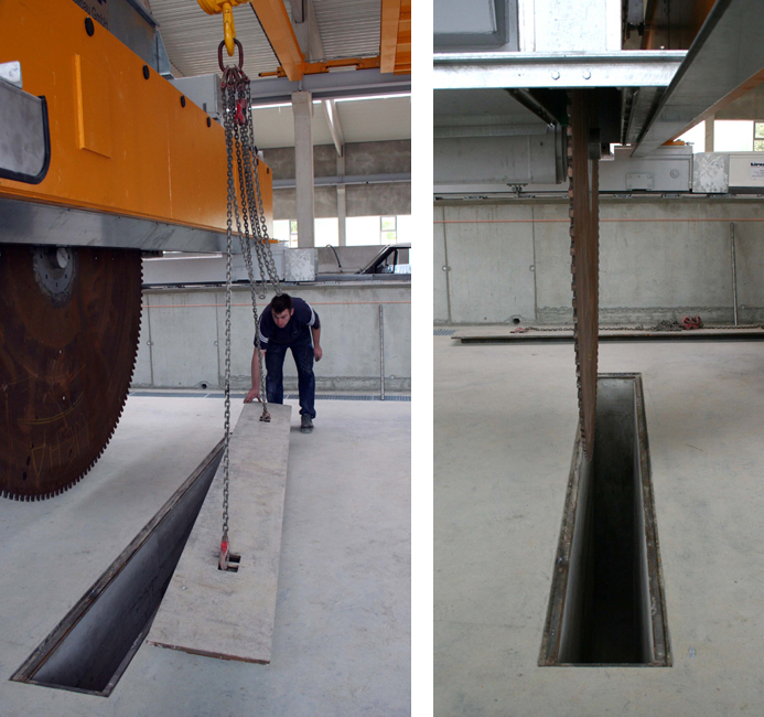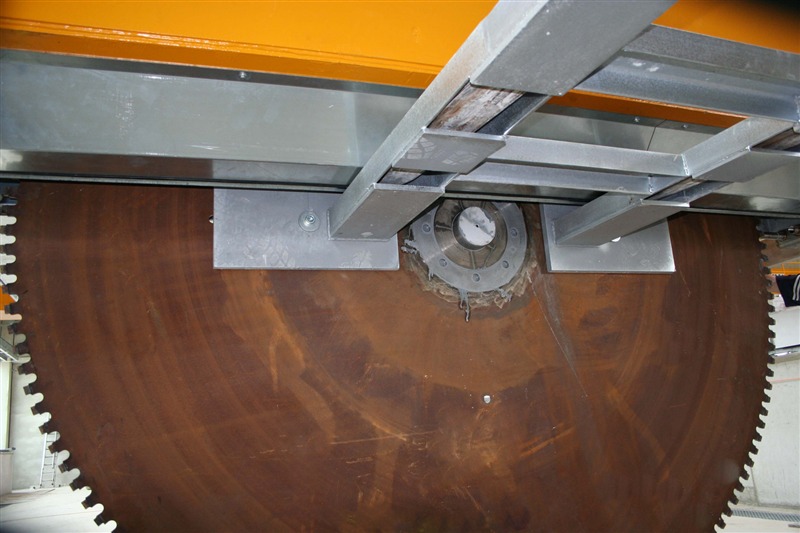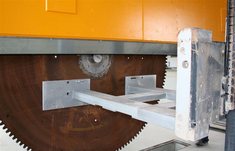 Zum Sägeblattwechsel fährt der Stapler heran und das Sägeblatt wird über Transportbohrungen mit den Metallplatten der Wechselvorrichtung verschraubt. Nun kann die Einspannung gelöst und das Sägeblatt von der Zentrierung gezogen und abgesenkt werden. Bei großen Sägeblättern über drei Meter Durchmesser ist ein Schacht nötig, in den das Sägeblatt vor dem Abtransport abgelegt wird.
