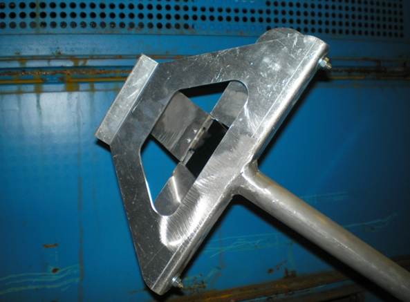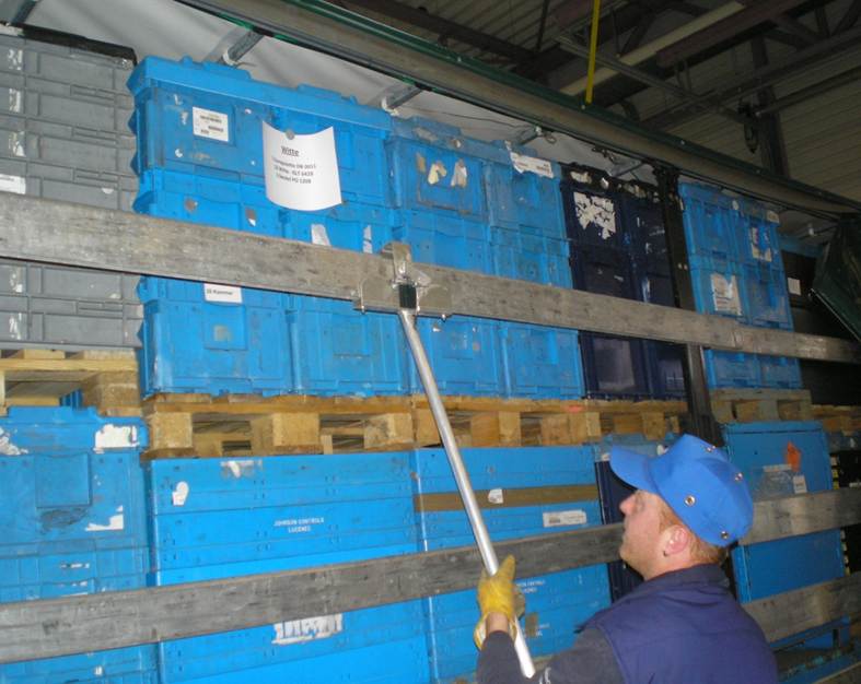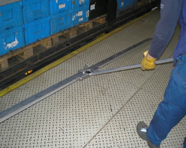Ein einfaches Hilfsmittel ermöglicht die Entnahme der Latten vom Boden aus. Dazu wurde ein Aluminiumrohr mit einem Klemmmechanismus versehen, der über einen Seilzug und einen Hebel am anderen Ende bedienbar ist. Die Greifer sind in zwei Längen für Außen- oder Dockbereich konstruiert. Mit dem neuen Hilfsmittel kann das Entnehmen der Querlatten vom Lkw deutlich einfacher und sicherer durchgeführt werden.