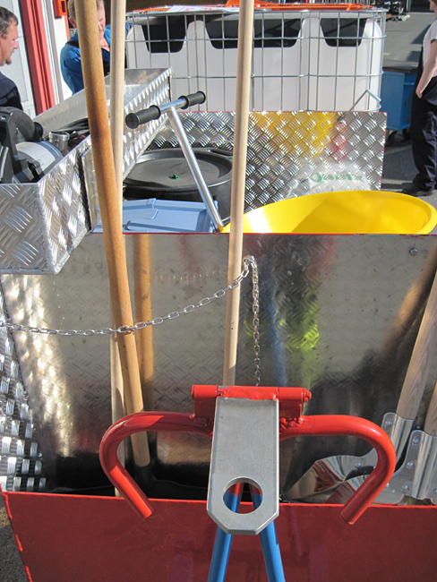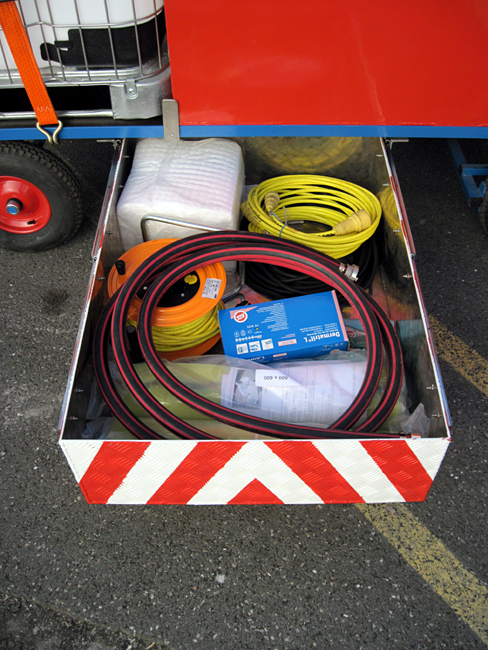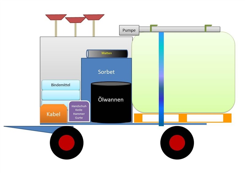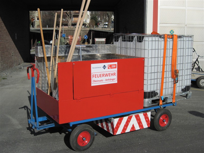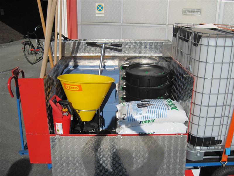 Der Wagen kann entweder an die Fahrzeuge der Werksfeuerwehr angehängt oder von Hand gezogen werden und ist bei einem Notfall sofort verfügbar. Die kompakte Bauweise ermöglicht den Transport aller benötigten Werkzeuge, Mittel und Geräte auf kleinstem Raum. Bei jedem Einsatz stehen Ölwannen sowie Bindemittel und eine Pumpe bereit. Zur Ausrüstung zählen außerdem Schieber, Schaufel und Besen sowie Kabel und ein ABC-Löscher. Der Wagen wurde von Mitarbeitern des Unternehmens konzipiert und konstruiert.