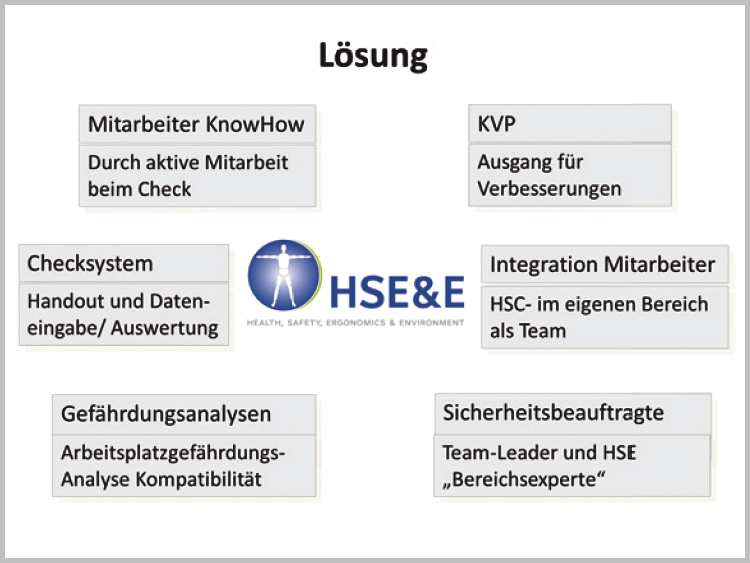 Es wurde eine Checkliste entwickelt, mit der die Sicherheitsbeauftragten eigene und fremde Arbeitsbereiche systematisch beurteilen sollen. In der Checkliste werden auf Basis der relevanten Gefährdungs- und Belastungsfaktoren die aktuellen Zustände an den einzelnen Arbeitsplätzen erfasst und bewertet. Die Einstufung geschieht über die Vergabe von Punkten. Die Auswertung der Checklisten erfolgt grafisch nach dem Ampelprinzip.