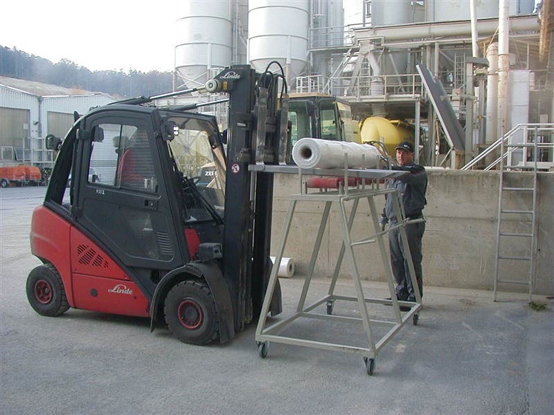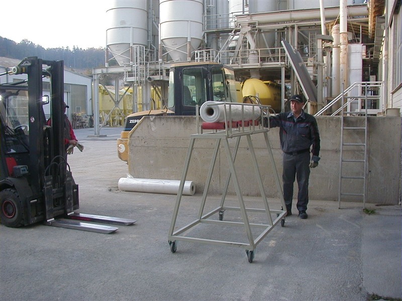 Für den Transport der Folienrolle wurde im Werk ein spezielles Gestell konstruiert. Dieses Gestell ist A-förmig aufgebaut und besitzt Fahrrollen mit arretierbaren Bremsen. Die Aufnahme besteht aus vier Tragrollen, die die Folienrolle aufnehmen. An beiden Seiten jeder Rolle sind vertikale Vierkanteisen angebracht. Zusätzlich ist ein Arretierungsgestell installiert, das nach dem Auflegen der Folienrolle umgeklappt wird.