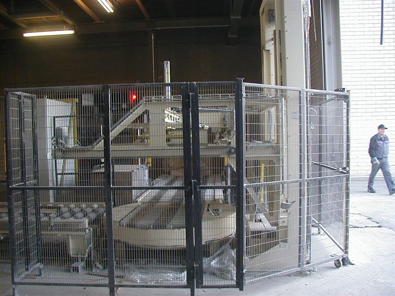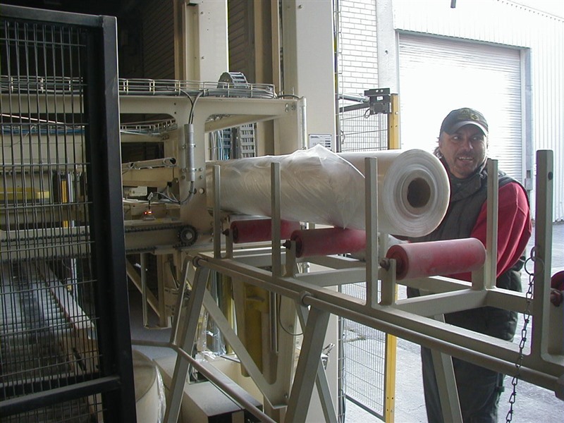 Die Folienrolle wird per Gabelstapler auf das Gestell gelegt und die Arretierung umgeklappt. Die Rolle ist nun allseitig gegen Herunterfallen gesichert und kann per Hand zum Folienwickler geschoben werden. Die Zugangstür der Umzäunung ist den Maßen des Transportgestelles angepasst. Das Gestell mit der Folienrolle wird zum Wechsel vor die Zugangstür geschoben, das Hubgestell des Folienwicklers auf die entsprechende Höhe gefahren und die Tür geöffnet. Das Arretierungsgestell wird umgeklappt und die Folienrolle kann nun von der Seite auf die Tragrollen des Folienwicklers geschoben werden. Nach dem Schließen der Tür ist die Anlage wieder einsatzbereit.