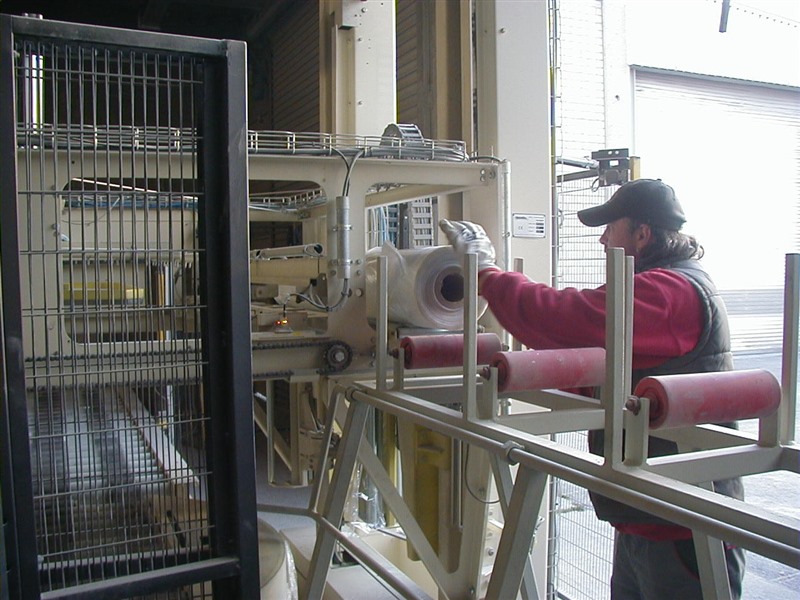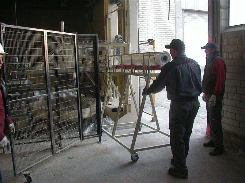 Die Firma Kalkwerk RYGOL GmbH & Co. KG, Painten, produziert Sackware, die in einer automatischen Anlage auf Paletten gestapelt und anschließend mit Folie umwickelt wird. Die Folie schützt die Säcke gegen Herunterfallen und gegen Umwelteinflüsse. Der Wechsel der Folienrolle erfolgt manuell. Dazu wird zunächst die Anlage abgeschaltet und die alte Rolle entfernt. Die neue Rolle mit einem Gewicht von mehr als 200 Kilogramm wird per Stapler aufgenommen, über die Umzäunung der Anlage gehoben und in die Endposition geschoben. Dabei muss von einer Leiter aus händisch die Lage der Rolle korrigiert oder die räumlich beengte Anlage betreten werden. Ein neues Transportgestell soll den Wechsel sicherer gestalten.