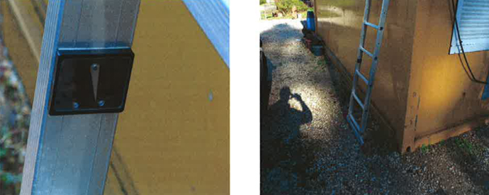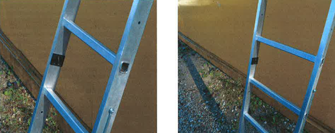 Es handelt sich um einen Winkelmesser, der mit Selbstklebefolie auf der Leiter aufgebracht wird. Dieser besteht aus einem Lot, das sich je nach Lage der Leiter ausrichtet. Im Winkelmesser sind Markierungen angebracht. Sie zeigen an, in welchem Bereich sich das Lot befinden soll, damit der richtige Anlegewinkel gewährleistet ist.