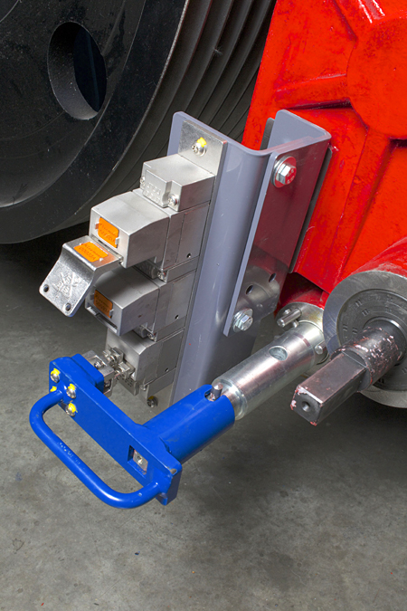 Neben diesem Schlüsselsystem gibt es eine aufsteckbare Arretier- und Dreheinrichtung, die es erlaubt, den Rotor des Brechers über ein Getriebe manuell von außen in jede Position zu drehen und zu blockieren. Der Austausch von Schlagleisten sowie die Beseitigung von Verstopfungen können dann gefahrlos erfolgen.