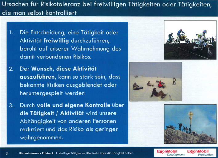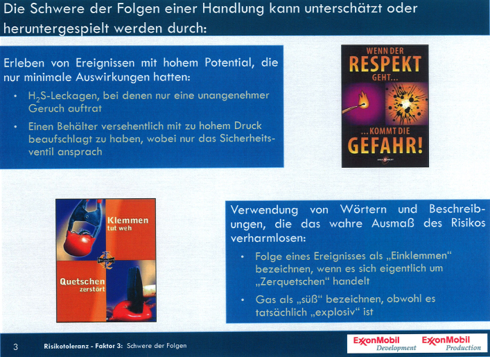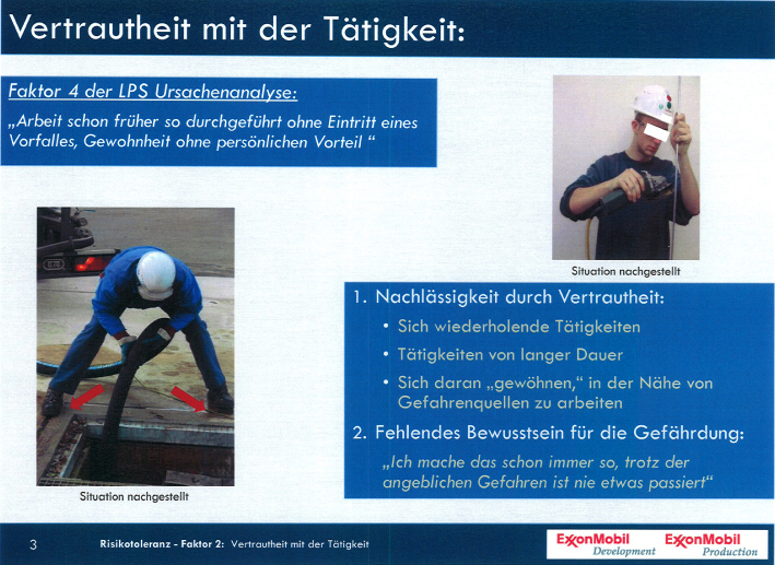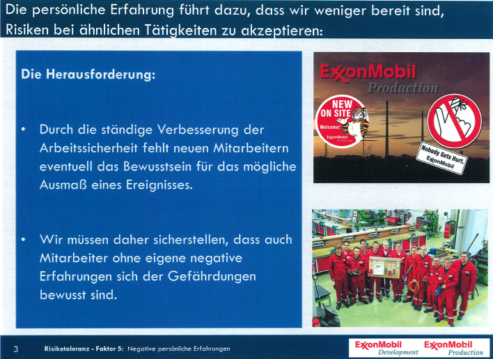 Die ExxonMobil Production Deutschland GmbH (EMPG), Hannover, verfolgt als oberstes Unternehmensziel, alle Arbeiten sicher auszuführen. Sie manifestiert dieses nach außen hin sichtbar durch die Verpflichtung: „Nobody gets hurt“ – Niemand wird verletzt. Eine Analyse der Unfälle und Beinaheunfälle in 2012/13 ergab, dass bei einigen Arbeiten eine erhöhte Risikobereitschaft seitens der Mitarbeiter und Kontraktoren vorlag.