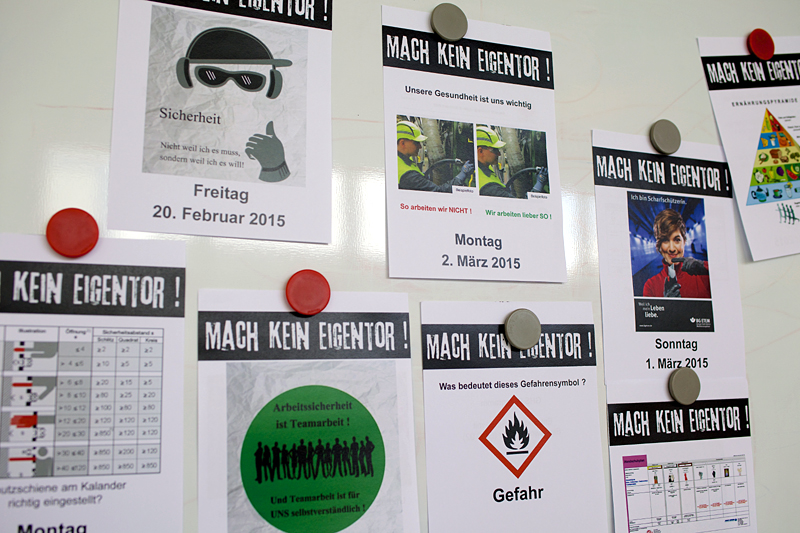 Ein weiterer Aspekt, der für den Abreißkalender in Tagesform spricht, sind die im Betrieb täglich stattfindenden Sicherheitskurzgespräche. Die Vorgesetzten führen zu Schichtbeginn mit ihren Beschäftigten Gespräche, für die das jeweilige Tagesthema des Kalenders als Grundlage dient. Auf den Rückseiten der Kalenderblätter sind Erklärungen oder Hinweise hinterlegt, die zur Unterstützung und Vereinfachung des täglichen Betriebsablaufes beitragen. Auch die Überschrift „Mach’ kein Eigentor!“ auf jedem Blatt soll die Wichtigkeit der persönlichen Einstellung und die Verpflichtung jedes Beschäftigten, in einem sicheren Umfeld zu arbeiten, unterstreichen. Der Kalender wird in Sicherheitsdialogen und Plakataktionen, aber auch als Bildschirmschoner für das werkseigene Intranet eingesetzt.