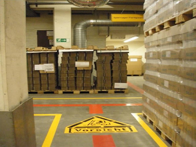 In einem ersten Schritt wurden Hauptlaufwege definiert und gekennzeichnet. Ein solcher Laufweg bietet Raum für Fußgänger, um sich sicher zu bewegen, während parallel der Staplerverkehr läuft. Der „rote Sicherheitsfaden“ zeigt, wo diese Wege verlaufen. An den Kreuzungspunkten zwischen Staplerverkehr und dem Laufweg wird durch besondere Kennzeichnung auf die Gefährdung hingewiesen. An diesen Punkten wurden außerdem Kugelspiegel zur Erhöhung der Einsehbarkeit des Kreuzungsbereichs installiert.