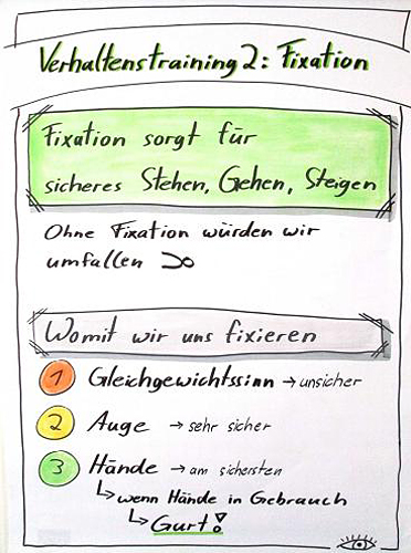 Um eine dauerhafte Verhaltensänderung zu erreichen, wurde mit einem externen Kooperationspartner ein langfristiges Schulungskonzept entwickelt. Dieses Konzept ist Teil eines übergeordneten Trainings zur Vermeidung von unbewusstem Fehlverhalten und umfasst das Trainieren von Gefahrenwahrnehmung, Arbeitsverhalten sowie Fixation und Sensomotorik. Die Schulung besteht aus einem theoretischen und einem praktischen Teil.