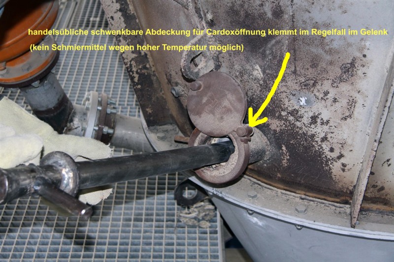 Für die Beseitigung der Anbackungen wird ein Druckgasverfahren, das sogenannte Cardoxverfahren, angewendet. Hierfür wird ein mit CO2 gefülltes Rohr durch spezielle Stutzen in das Zykloninnere eingebracht. Diese Stutzen besitzen eine Klappe, die pendelfähig vor der Öffnung angebracht ist. Die Klappe wird zur Seite bewegt, das Rohr eingeführt und ein Gasstoß löst die Anbackungen. Nach dem Herausziehen des Rohres aus dem Stutzen sollen die Pendelklappen eigentlich von selbst wieder vor die Öffnung fallen, damit es nicht zu einem unkontrollierten Auslaufen von Heißmehl kommt. Trotz Hitzeschutzkleidung kann das heiße Material den Mitarbeitern schwere Verbrennungen zufügen, wenn es z. B. zwischen Jackenärmel und Handschuh läuft. Diese Pendelklappen korrodieren jedoch sehr schnell und verlieren dadurch an Beweglichkeit.