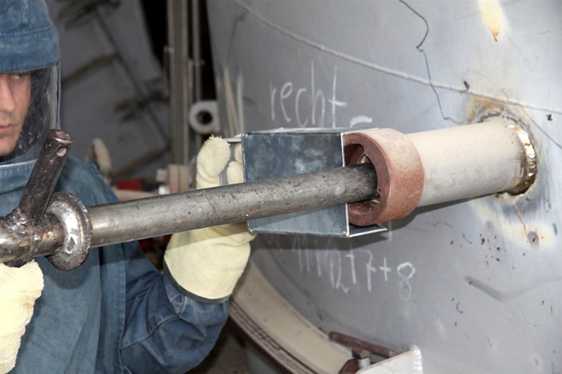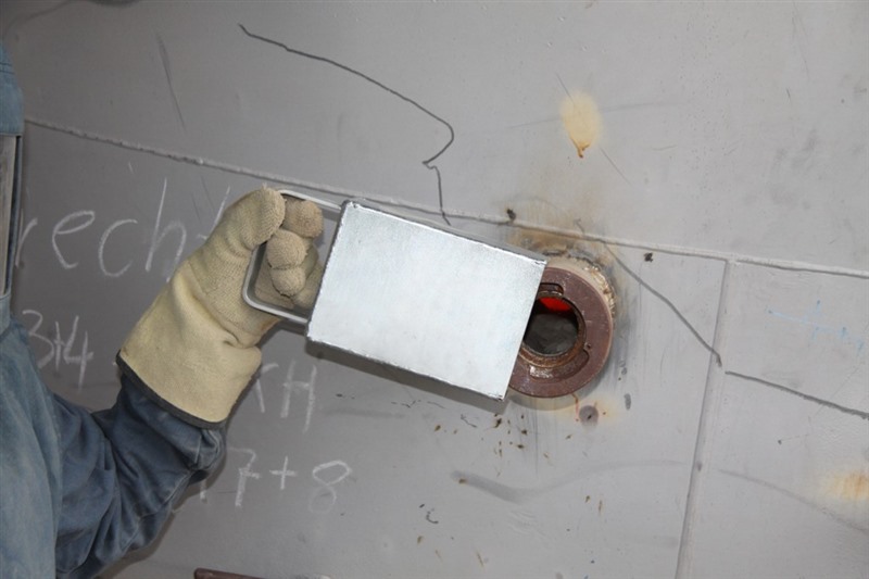 Ein findiger Mitarbeiter der Deuna Zement GmbH hat eine Vorrichtung entwickelt, mit der die Öffnung unmittelbar nach der Entnahme des Cardoxrohres verschlossen werden kann. Dieser sogenannte Heißmehlhemmschuh besteht aus einem rechteckigen Metallgehäuse mit einem Griff auf der geschlossenen Oberseite. Das Gehäuse ist auf der Unterseite vollständig offen und auf der Rückseite so weit ausgeschnitten, dass die Vorrichtung passgenau auf den Cardoxstutzen aufgeschoben werden kann. Vor dem Herausziehen des Cardoxrohres wird der Heißmehlhemmschuh seitlich an den Stutzen angesetzt. Ist das Rohr vollständig herausgezogen, schiebt ein zweiter Mitarbeiter den Hemmschuh unverzüglich über die Stutzenöffnung. Somit wird ein Heißmehlaustritt effektiv verhindert und das Cardoxrohr kann ohne Hektik abgelegt werden. Die Verschlusskappe kann angesetzt und nach dem Zurückziehen des Hemmschuhs in die Cardoxöffnung eingeschraubt werden.