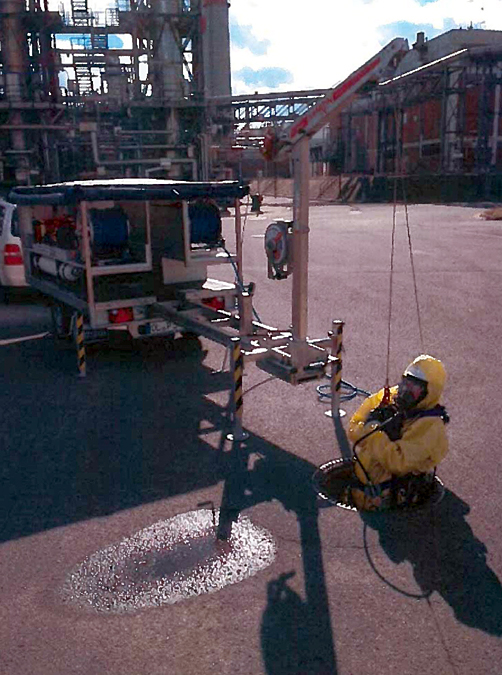 Bei Arbeiten in Erdbehältern und Gruben muss ein Mitarbeiter von oben durch einen engen Schacht in den Behälter steigen. Dazu wird eine Leiter in den Schacht gestellt und anschließend ein Dreibein über dem Schacht positioniert, an dem der Mitarbeiter angeschlagen wird. Diese Vorgehensweise benötigt viel Raum im Schacht. Das Dreibein kann darüber hinaus an Stellen mit unebenem Boden oder an Bordsteinen nicht standsicher aufgebaut werden. Ein Anhänger mit Spezialaufbau behebt diese Probleme.