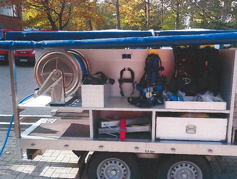 Diese Entwicklung hat gegenüber dem herkömmlichen System den Vorteil, dass der Einstieg wesentlich einfacher durchzuführen ist, weil die Platzverhältnisse großzügiger sind. Darüber hinaus ist die Standsicherheit der Konstruktion jederzeit gewährleistet. Die in das Hebesystem integrierte Atemluftversorgung schafft Platz vor Ort, weil im Gegensatz zum früheren Vorgehen kein zusätzlicher Anhänger mit Atemluftversorgungseinrichtung mitgeführt werden muss. Im Notfall wird eine Evakuierung dadurch erleichtert.
