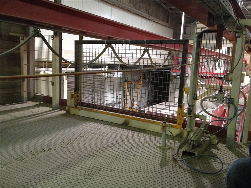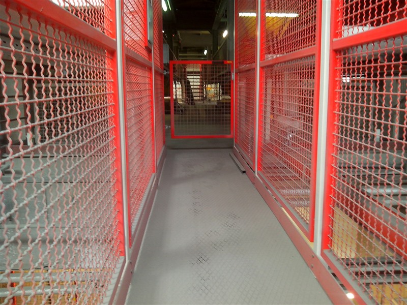 Zur Wartung der Kübel ist eine Kübelbahnbühne installiert. Diese Bühne befindet sich in etwa fünf Metern Höhe und überspannt den gesamten Bereich unterhalb der Mischer. Hier sind Schutzgitter installiert, die sowohl die Fahrbereiche der Kübelbahnen als auch die Rückseite der Bühne absichern. Die Vorderseite kann jedoch nicht mit einer feststehenden Absturzsicherung ausgestattet werden, weil dort die Kübelbahnen im Regelbetrieb ein- und ausfahren. Ein neues, bewegliches Schutzgitter, das in die Steuerung der Anlage integriert ist, schafft Abhilfe.