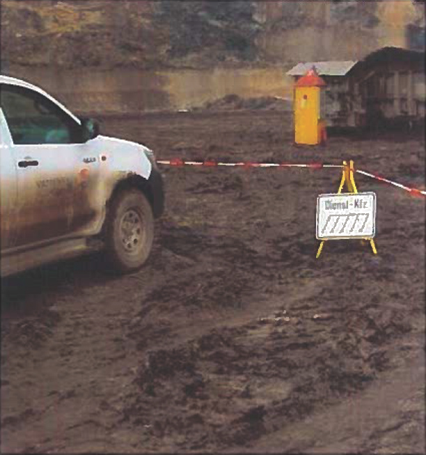 Die Servicepartnerfirmen informieren sich bei Ankunft auf der Baustelle am Info-Punkt, bei wem sie sich anzumelden haben. Nach der fernmündlichen Anmeldung erfolgt die spezifische Arbeitseinweisung im Büro der verantwortlichen Person. Nach Abschluss der Reparatur werden die Beschilderungen wieder im Info-Punkt eingeschlossen und dieser mittels Radlader zurück auf die Transportbühne verbracht.