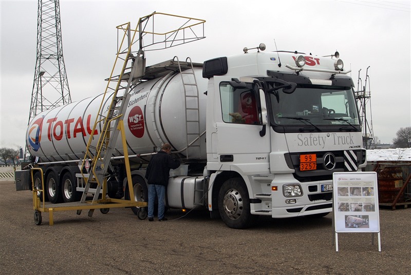 Jörg Bley von der TOTAL Bitumen Deutschland GmbH hat sich mit den verschiedenen Problemstellungen beschäftigt und einen sicherheitstechnisch optimierten Tanksattelauflieger entwickelt. Um die Sicherheit bei langen Transportstrecken zu verbessern, wurde das Fahrzeug mit Rückfahrkameras, einem Fahrspurassistenten, einer Abstandsregelautomatik, einer Kameraüberwachung der Seiten (im Spiegel) sowie einem Display für den Entladevorgang ausgerüstet.