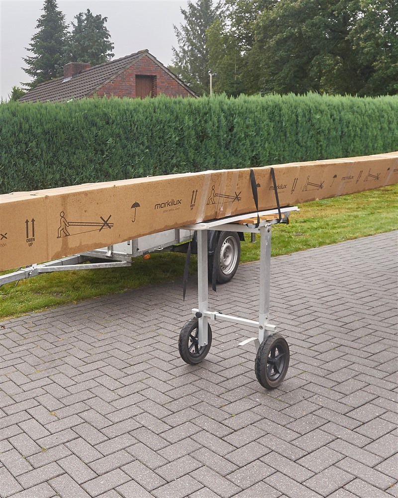 Sicherer und ergonomischer Transport von Markisen mit speziellem Anhänger und einer Transporthilfe