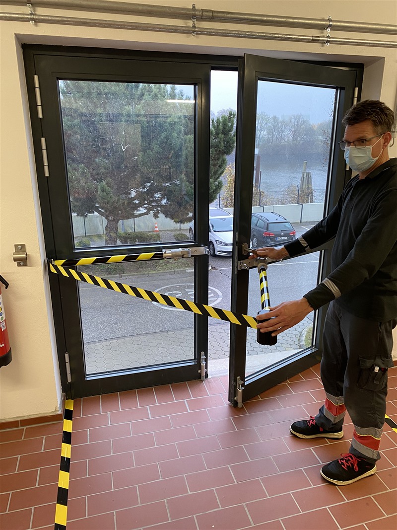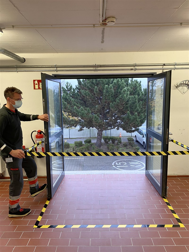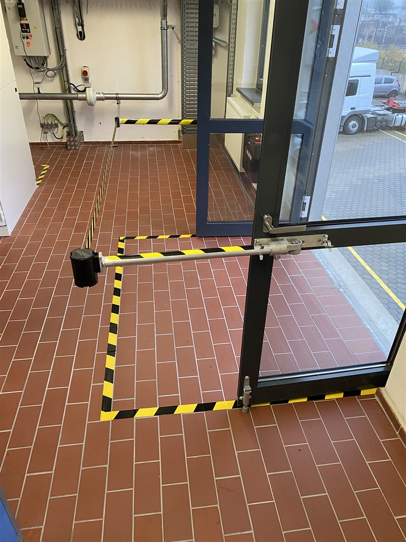 Personen ohne eine Höhensicherungs-Ausbildung, die regelmäßig oder gelegentlich auf hoch gelegenen Arbeitsplätzen arbeiten, sollen Außentüren öffnen können, ohne in den absturzgefährdeten Bereich zu gelangen.