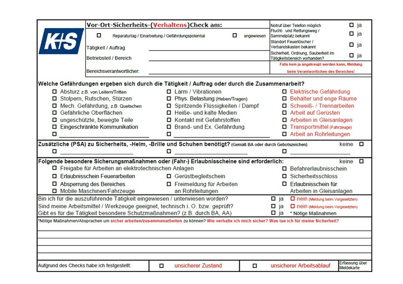 Arbeitsabläufe und Umfeld werden gemeinsam betrachtet, bewertet und dokumentiert. Als Hilfe dient eine übersichtliche Checkliste: der Vor-Ort-Sicherheits-Verhaltens-Check. Ermitteltes Verbesserungspotenzial wird direkt dokumentiert. So werden technische Maßnahmen, Sonderunterweisungen oder die Bereitstellung von spezieller Schutzausrüstung und Hilfsmitteln umgehend eingeleitet.
