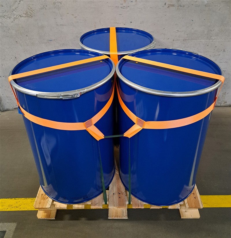 Da es keine geeignete Lösung zur Fixierung von Einzelkleingebinden auf Paletten gab, wurde gemeinsam mit der Firma Rothschenk ein System entwickelt. Ein Haltegurt wird über das Gebinde gelegt und an der Palette niedergezurrt, ergonomisch in Arbeitshöhe. Die Fixierung erfolgt per PET-Band oder wiederverwendbarem Gurt für innerbetriebliche Transporte mit Ratsche. Dies erhöht die Arbeitssicherheit und Nachhaltigkeit.