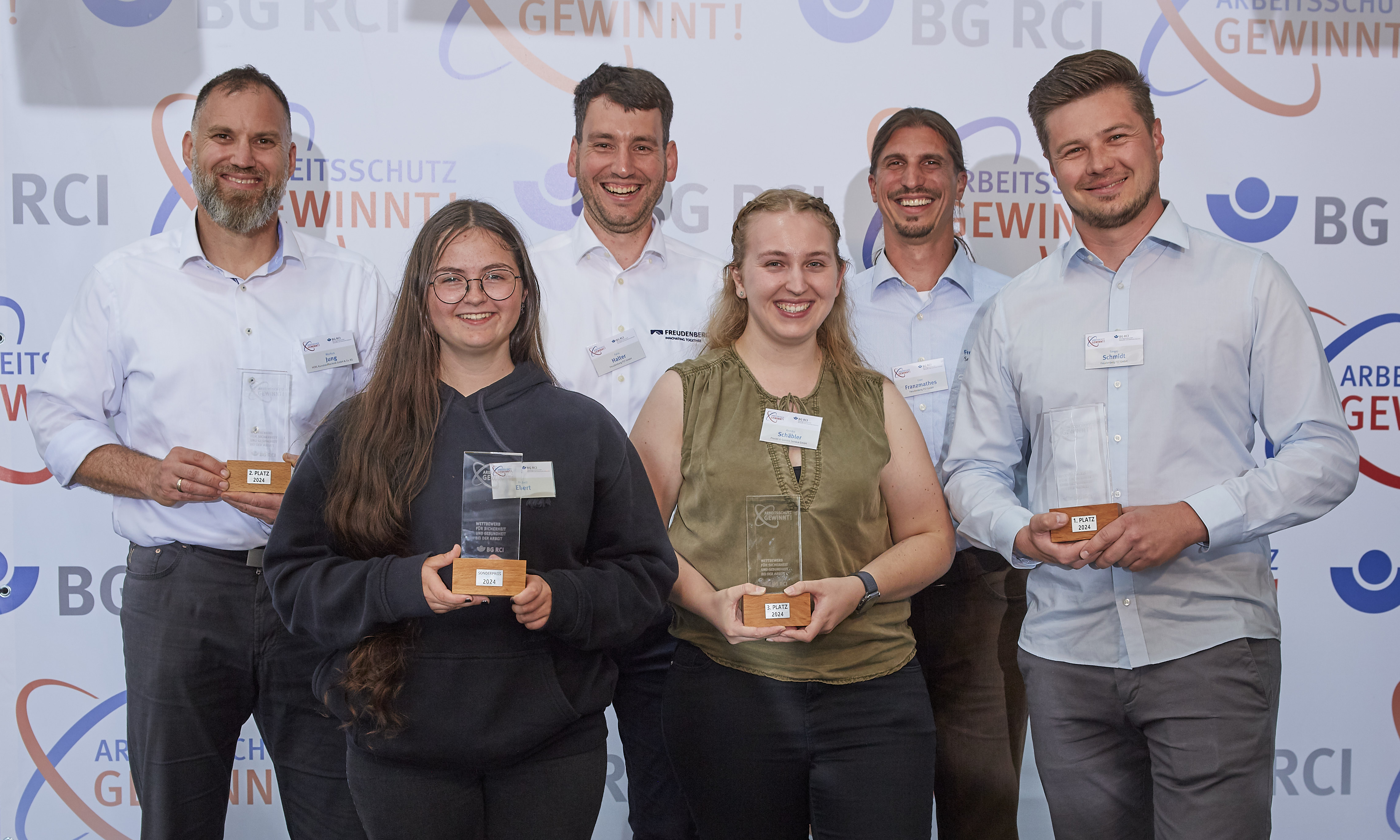 Die Preisträgerinnen und Preisträger des Wettbewerbs „Arbeitsschutz GEWINNT! 2024 der BG RCI (v. l.):